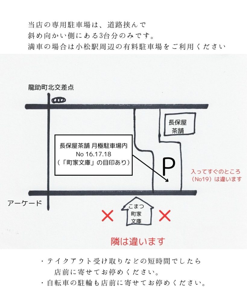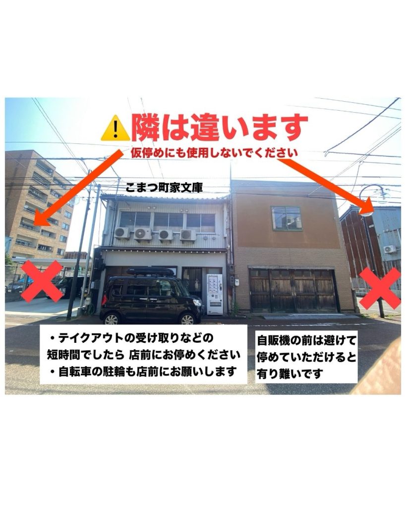 ご迷惑となりますので、他店舗さまの駐車場などへの無断駐車はなさらないようお願いいたします。「こまつ町家文庫」の目印がない場所は、すべてNGです。分からない場合は、店前に停めてスタッフにお尋ねください。