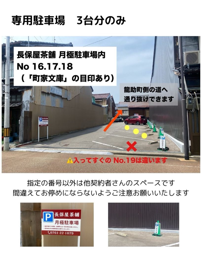 ● 当店の専用駐車場は【道路挟んで斜め向かい側】にある「 長保屋茶舗さま月極駐車場」のうち No 16.17.18番です。「町家文庫」の目印があります