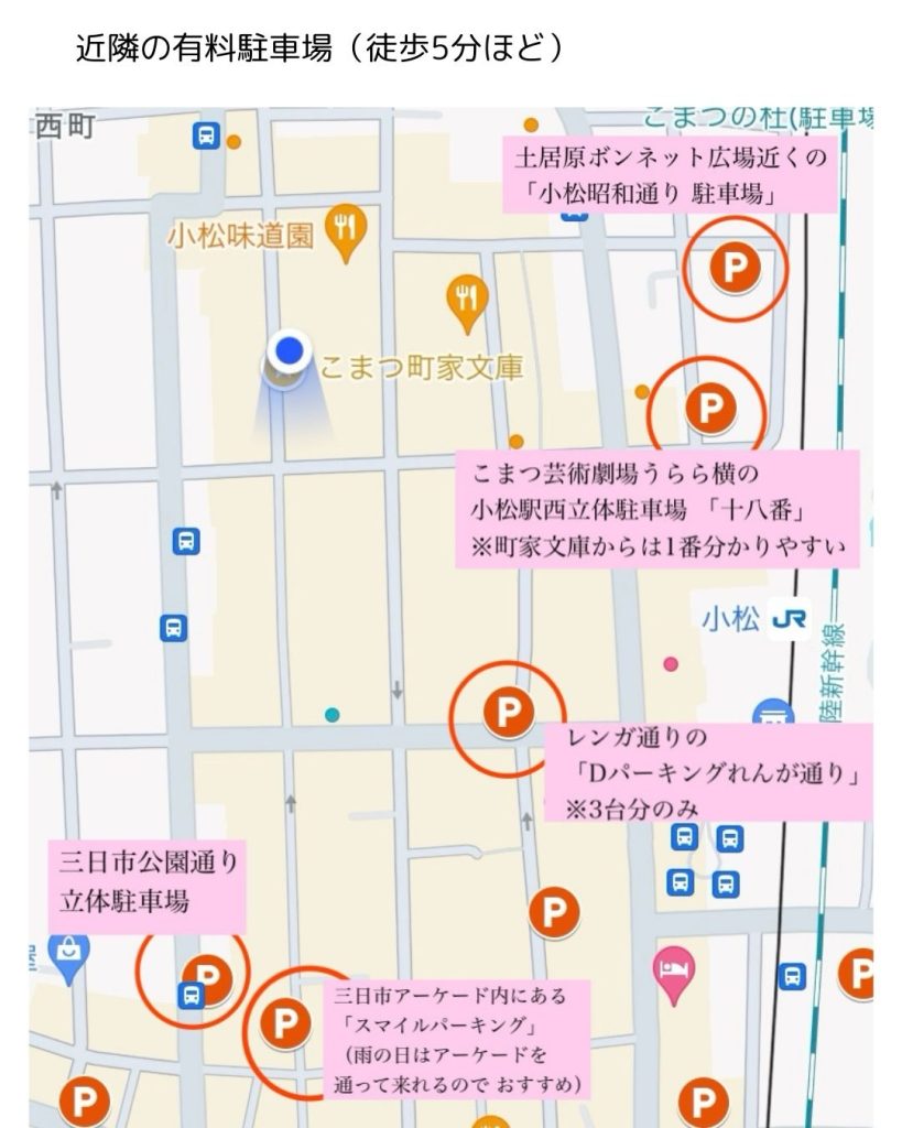 他にも有料駐車場は小松駅周辺に点在しております。分かりやすいように 場所をGoogleマップに落とし込んでみました。参考になれば幸いです。
