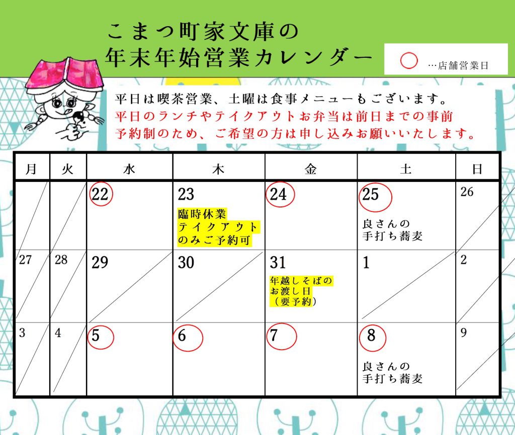● 年内の営業は25日(土)まで、年始は1月5日(水)からのスタートです。