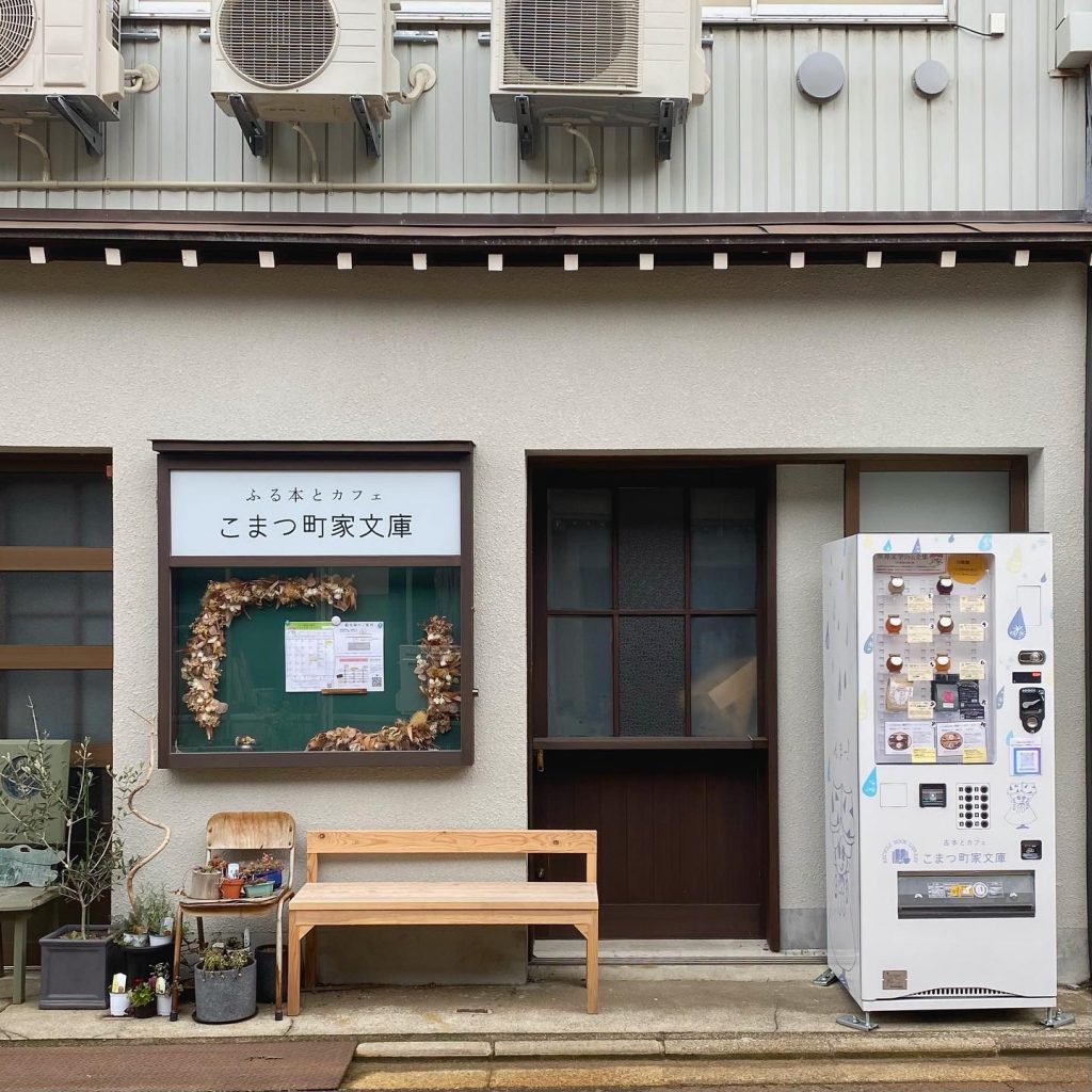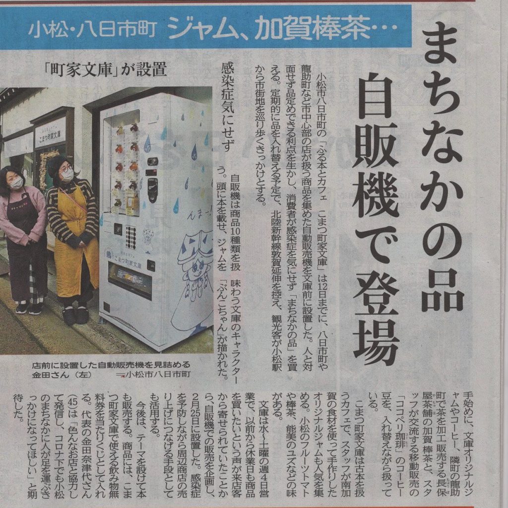 3/13付けの北國新聞さんにもご紹介いただきましたが、このたび店前にこまつ町家文庫の自動販売機を設置いたしました。