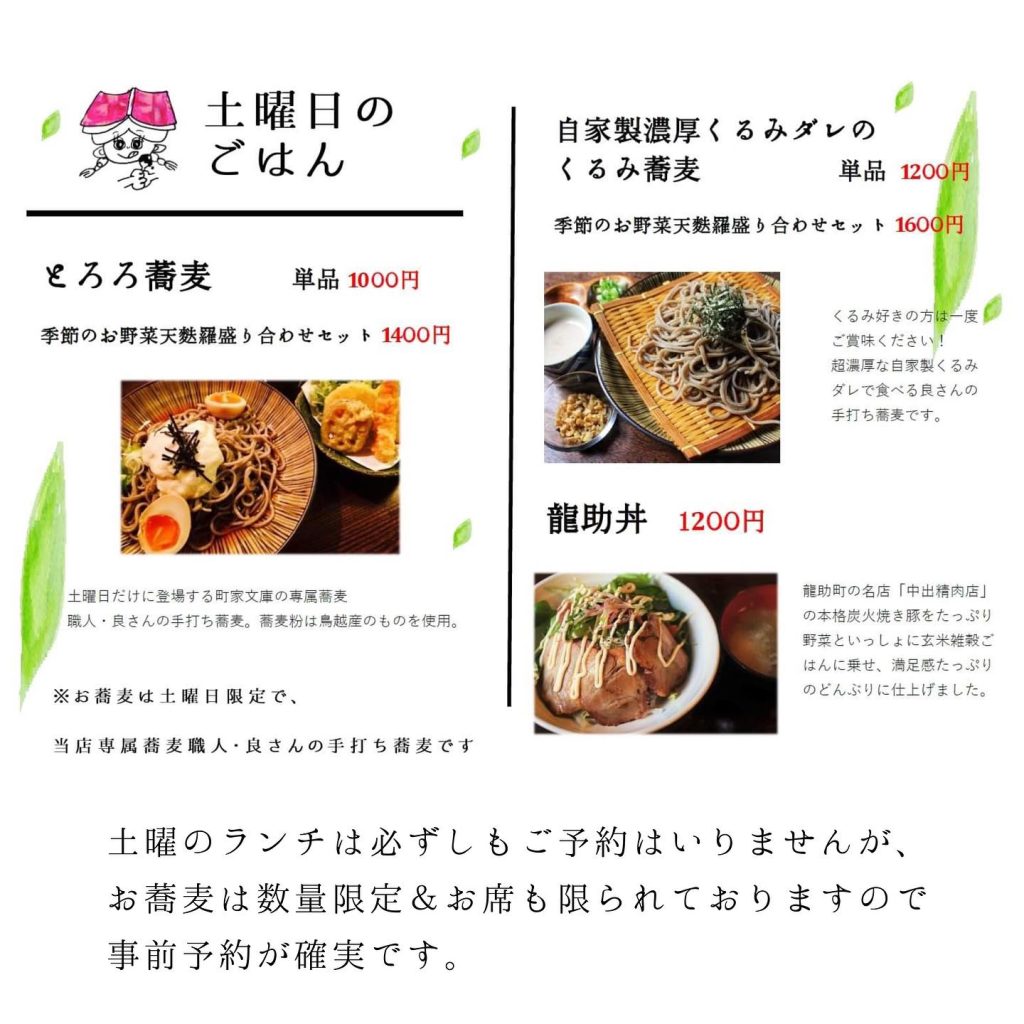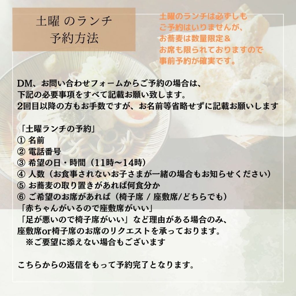◯ 土曜のランチ土曜日は良さんの手打ち蕎麦などのお食事メニューがございます。必ずしもご予約はいりませんが、お蕎麦は数量限定&お席も限られておりますので事前予約が確実です