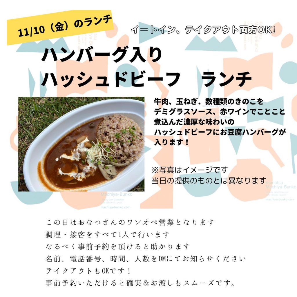 ◯ 11/10(金)のランチハンバーグ入りハッシュドビーフの日この日はおなつさんのワンオペ営業となります調理・接客をすべて1人で行いますお待たせしたりご迷惑おかけすることがあるかもしれませんが何卒よろしくお願いいたします。なるべくは事前予約をお願いいたしますプレートランチ、彩り玄米弁当はお休みですハッシュドビーフのテイクアウトはできます!