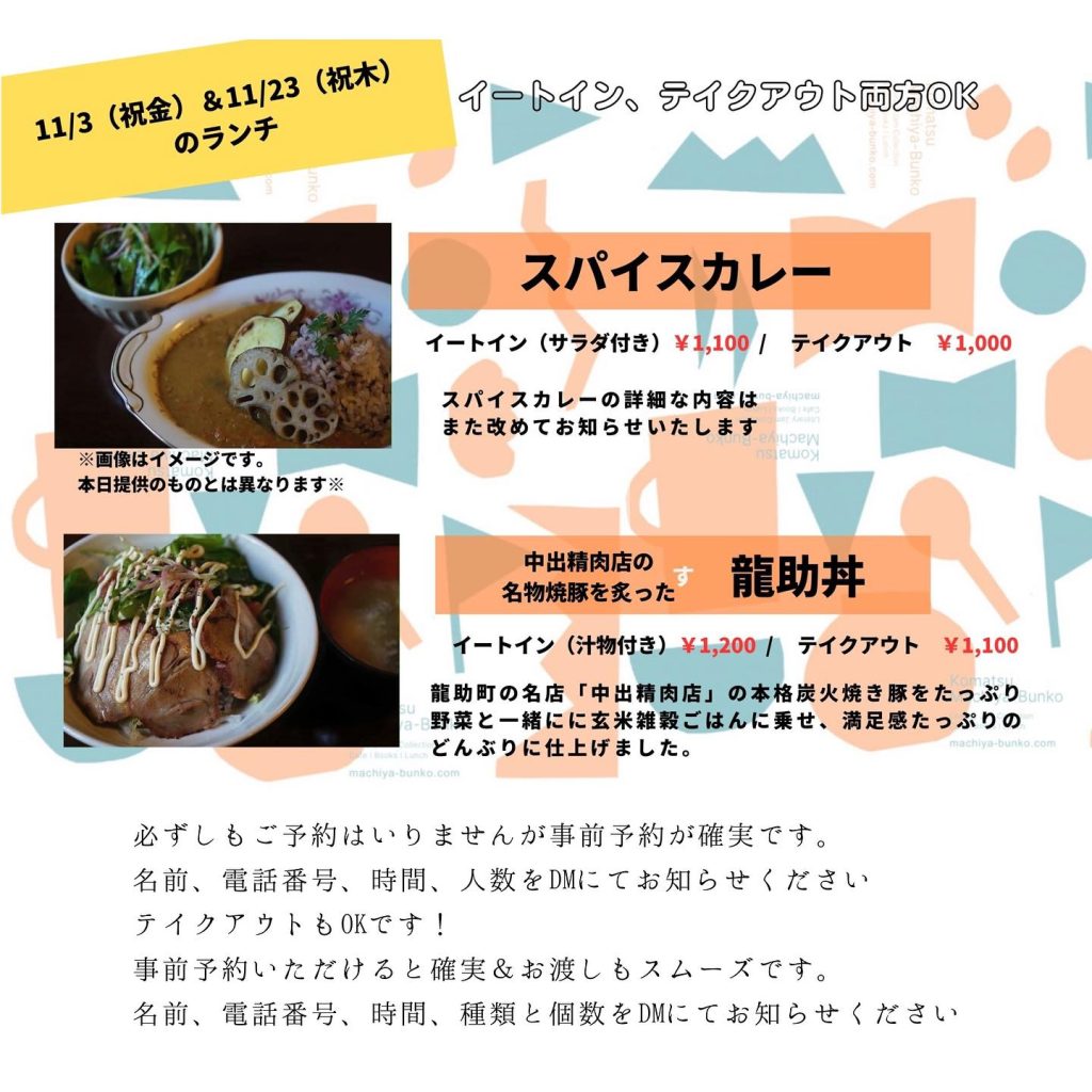 ◯ 11/3、11/23 の祝日のランチスパイスカレーの日必ずしもご予約はいりませんが事前予約が確実ですカレーはテイクアウトも可能です!プレートランチ、彩り玄米弁当はお休みです