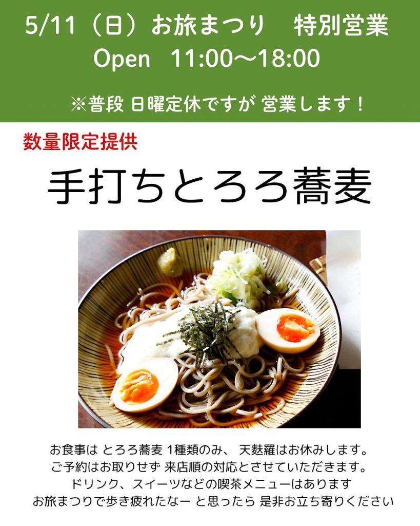 5/11(日) 普段 日曜は定休ですが お旅まつりなので 開けます◎ ただ、この日は スタッフが少ないため お食事は とろろ蕎麦 1種類のみ、 天麩羅はお休みします。また、ご予約はお取りせず 来店順の対応とさせていただきます。
